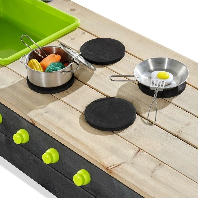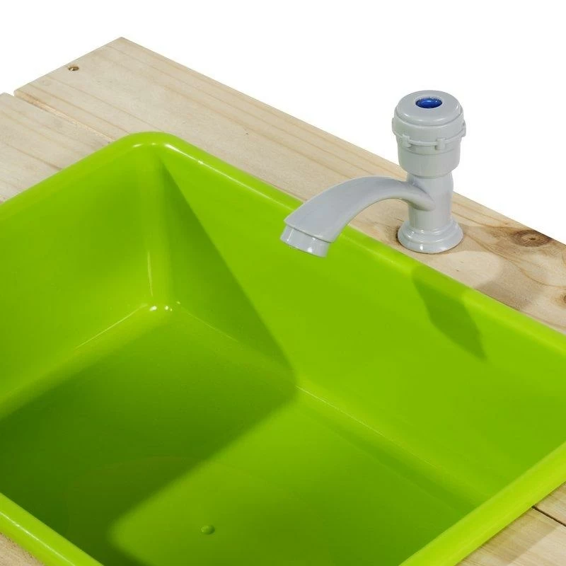 Le plan de travail de la cuisine est équipé d’une cuisinière à boutons rotatifs et d’un évier avec un vrai robinet de travail. Le robinet fonctionne lorsque vous y connectez le tuyau d’arrosage et grâce à l’évier amovible, l’eau du robinet est facile à retirer de l’évier. Sous le plan de travail de la cuisine se trouve un grand espace de rangement où vous pouvez ranger tous les jouets, tels que les casseroles, lorsque les enfants ont fini de jouer.