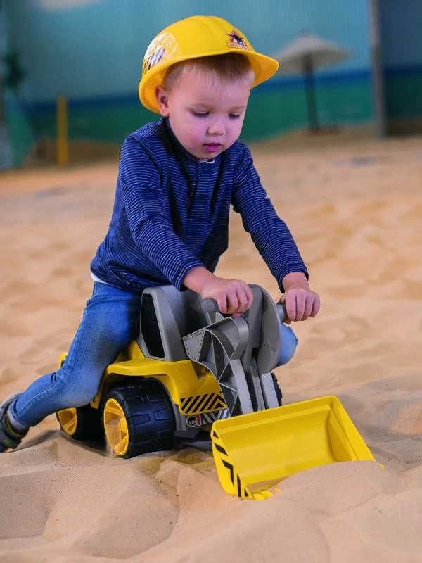Equipé d’un grand siege, l’enfant est assis confortablement.
