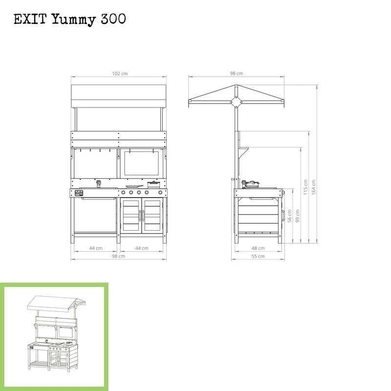 La cuisine extérieure en bois EXIT Yummy 300 est une cuisine de jeu multifonctionnelle pour les enfants de 2 à 5 ans. La cuisine est entièrement équipée et le toit vert et le tableau noir rendent cette cuisine ludique unique. Avec les accessoires de cuisine inclus tels que les casseroles, les ustensiles et les aliments, la cuisine extérieure EXIT Yummy prend vie !