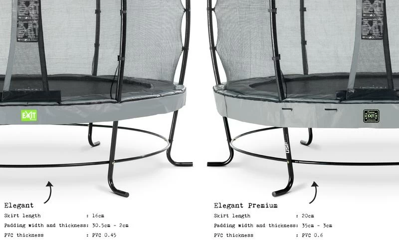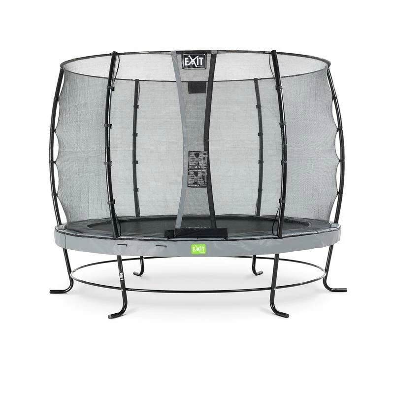 Le trampoline EXIT Elegant avec filet de sécurité Economy est un trampoline de bonne qualité. Le trampoline Elegant d’EXIT Toys possède le cadre le plus stable au monde, est durable, de bonne qualité et très facile à monter. Le cadre de stabilité ultime (USF) breveté, avec ses pieds uniques en forme de L, est extrêmement solide et donc super sûr et stable. Ce trampoline EXIT Elegant est équipé en série d’un filet de sécurité Economy avec une entrée adaptée aux enfants par la porte à recouvrement. Les trampolines EXIT Elegant sont non seulement beaux et de bonne qualité, mais aussi durables. Le cadre est galvanisé puis peint par poudrage, il n’y a donc aucun risque de rouille. Le système de fixation innovant du cadre rend le montage du trampoline beaucoup plus facile qu’avec d’autres trampolines. Le bord protecteur est robuste et équipé d’un système de protection des pieds (FPS) spécialement développé par EXIT Toys, de sorte que vous ne pouvez jamais mettre votre pied entre les ressorts pendant le saut sur trampoline. Le trampoline EXIT Elegant est prêt à l’emploi en une heure, alors qu’attendez-vous ? Sautons !