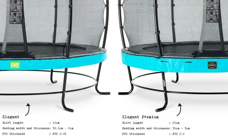 Le trampoline EXIT Elegant avec filet de sécurité Economy est un trampoline de bonne qualité. Le trampoline Elegant d’EXIT Toys possède le cadre le plus stable au monde, est durable, de bonne qualité et très facile à monter. Le cadre de stabilité ultime (USF) breveté, avec ses pieds uniques en forme de L, est extrêmement solide et donc super sûr et stable. Ce trampoline EXIT Elegant est équipé en série d’un filet de sécurité Economy avec une entrée adaptée aux enfants par la porte à recouvrement. Les trampolines EXIT Elegant sont non seulement beaux et de bonne qualité, mais aussi durables. Le cadre est galvanisé puis peint par poudrage, il n’y a donc aucun risque de rouille. Le système de fixation innovant du cadre rend le montage du trampoline beaucoup plus facile qu’avec d’autres trampolines. Le bord protecteur est robuste et équipé d’un système de protection des pieds (FPS) spécialement développé par EXIT Toys, de sorte que vous ne pouvez jamais mettre votre pied entre les ressorts pendant le saut sur trampoline. Le trampoline EXIT Elegant est prêt à l’emploi en une heure, alors qu’attendez-vous ? Sautons !