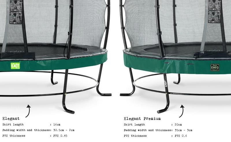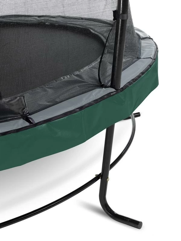 Le trampoline EXIT Elegant avec filet de sécurité Economy est un trampoline de bonne qualité. Le trampoline Elegant d’EXIT Toys possède le cadre le plus stable au monde, est durable, de bonne qualité et très facile à monter. Le cadre de stabilité ultime (USF) breveté, avec ses pieds uniques en forme de L, est extrêmement solide et donc super sûr et stable. Ce trampoline EXIT Elegant est équipé en série d’un filet de sécurité Economy avec une entrée adaptée aux enfants par la porte à recouvrement. Les trampolines EXIT Elegant sont non seulement beaux et de bonne qualité, mais aussi durables. Le cadre est galvanisé puis peint par poudrage, il n’y a donc aucun risque de rouille. Le système de fixation innovant du cadre rend le montage du trampoline beaucoup plus facile qu’avec d’autres trampolines. Le bord protecteur est robuste et équipé d’un système de protection des pieds (FPS) spécialement développé par EXIT Toys, de sorte que vous ne pouvez jamais mettre votre pied entre les ressorts pendant le saut sur trampoline. Le trampoline EXIT Elegant est prêt à l’emploi en une heure, alors qu’attendez-vous ? Sautons !