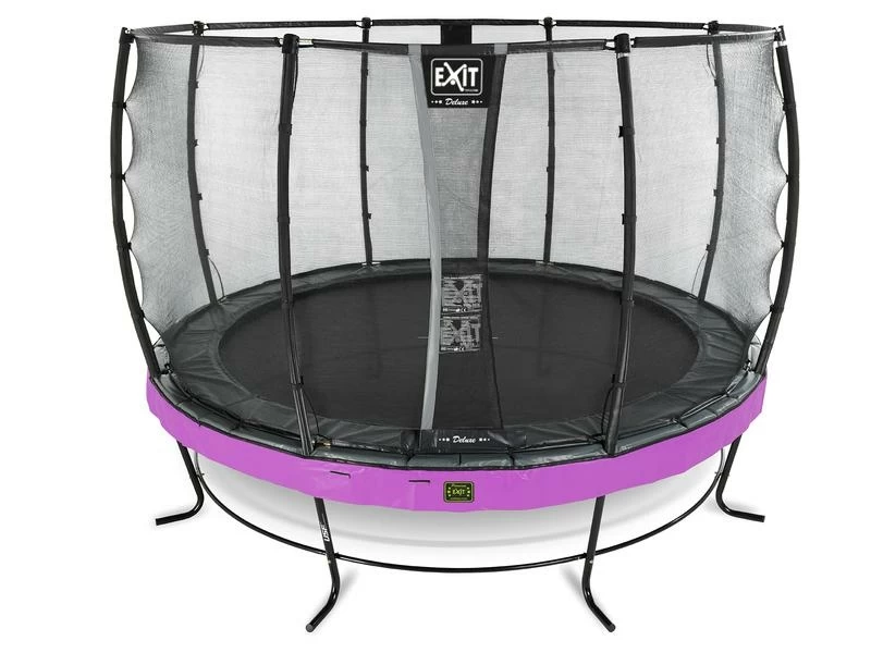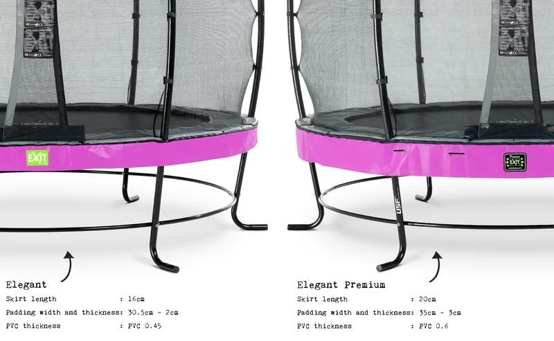 Le trampoline EXIT Elegant Premium avec filet de sécurité Deluxe est un trampoline de très bonne qualité. Le trampoline Elegant d’EXIT Toys possède le cadre le plus stable au monde, est durable, de bonne qualité et très facile à monter. Le cadre de stabilité ultime (USF) breveté, avec ses pattes uniques en forme de L, est extrêmement solide et donc super sûr et stable. Ce trampoline EXIT Elegant Premium est équipé en série d’un filet de sécurité Deluxe avec une entrée adaptée aux enfants par la porte à recouvrement. Le filet de sécurité Deluxe a une finition de haute qualité avec une mousse extra épaisse autour des poteaux et est tendu tout autour par des anneaux en fibre de verre en haut et en bas. Les trampolines EXIT Elegant Premium sont non seulement beaux et de bonne qualité, mais aussi durables. Le cadre est galvanisé puis revêtu de poudre, ce qui exclut tout risque de rouille. Comparé au trampoline Elegant standard, le trampoline EXIT Elegant Premium possède des ressorts extra longs pour une expérience de saut ultime et une jupe plus longue sur le bord de protection pour une plus belle apparence. Le rembourrage est également plus épais pour une protection encore plus grande et la couche supérieure en PVC plus épaisse prolonge la durée de vie. Le système de fixation innovant du cadre permet de monter le trampoline beaucoup plus facilement qu’avec d’autres trampolines. Le bord protecteur est robuste et équipé d’un système de protection des pieds (FPS) spécialement développé par EXIT Toys, de sorte que vous ne pouvez jamais mettre votre pied entre les ressorts pendant le saut sur trampoline. Le trampoline EXIT Elegant Premium est prêt à l’emploi en une heure, alors qu’attendez-vous ? Sautons !