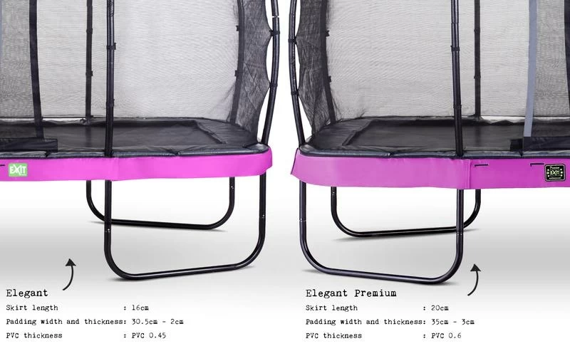 Le trampoline EXIT Elegant avec filet de sécurité Economy est un trampoline de bonne qualité. Le trampoline Elegant d’EXIT Toys possède le cadre le plus stable au monde, est durable, de bonne qualité et très facile à monter. Ce trampoline EXIT Elegant est équipé en série d’un filet de sécurité Economy avec une entrée adaptée aux enfants par la porte à recouvrement. Les trampolines EXIT Elegant sont non seulement beaux et de bonne qualité, mais aussi durables. Le cadre est galvanisé puis peint par poudrage, il n’y a donc aucun risque de rouille. Le bord de protection est robuste et équipé d’un système de protection des pieds (FPS) spécialement développé par EXIT Toys afin que vous ne puissiez jamais mettre votre pied entre les ressorts pendant le saut sur le trampoline. Le trampoline EXIT Elegant est prêt à l’emploi en une heure, alors qu’attendez-vous ? Sautons !