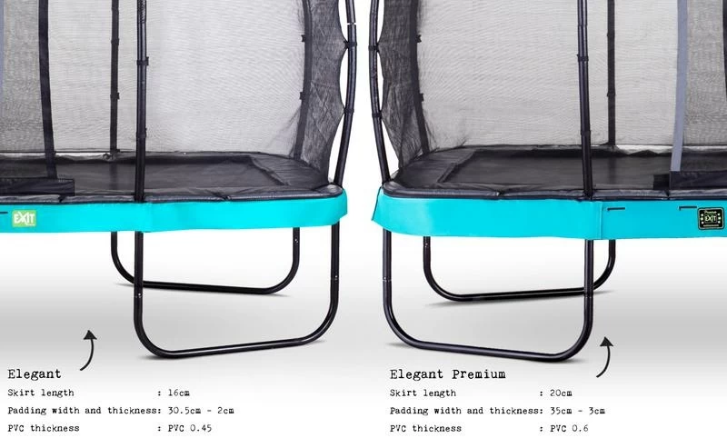 Le trampoline EXIT Elegant Premium avec filet de sécurité Deluxe est un trampoline de très bonne qualité. Le trampoline Elegant d’EXIT Toys possède le cadre le plus stable au monde, est durable, de bonne qualité et très facile à monter. Le cadre de stabilité ultime (USF) breveté, avec ses pattes uniques en forme de L, est extrêmement solide et donc super sûr et stable. Ce trampoline EXIT Elegant Premium est équipé en série d’un filet de sécurité Deluxe avec une entrée adaptée aux enfants par la porte à recouvrement. Le filet de sécurité Deluxe a une finition de haute qualité avec une mousse extra épaisse autour des poteaux et est tendu tout autour par des anneaux en fibre de verre en haut et en bas. Les trampolines EXIT Elegant Premium sont non seulement beaux et de bonne qualité, mais aussi durables. Le cadre est galvanisé puis revêtu de poudre, ce qui exclut tout risque de rouille. Comparé au trampoline Elegant standard, le trampoline EXIT Elegant Premium possède des ressorts extra longs pour une expérience de saut ultime et une jupe plus longue sur le bord de protection pour une plus belle apparence. Le rembourrage est également plus épais pour une protection encore plus grande et la couche supérieure en PVC plus épaisse prolonge la durée de vie. Le système de fixation innovant du cadre permet de monter le trampoline beaucoup plus facilement qu’avec d’autres trampolines. Le bord protecteur est robuste et équipé d’un système de protection des pieds (FPS) spécialement développé par EXIT Toys, de sorte que vous ne pouvez jamais mettre votre pied entre les ressorts pendant le saut sur trampoline. Le trampoline EXIT Elegant Premium est prêt à l’emploi en une heure, alors qu’attendez-vous ? Sautons !