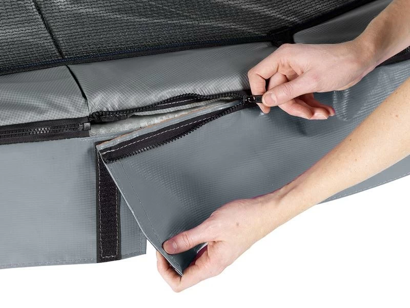Le trampoline EXIT Elegant Premium avec filet de sécurité Deluxe est un trampoline de très bonne qualité. Le trampoline Elegant d’EXIT Toys possède le cadre le plus stable au monde, est durable, de bonne qualité et très facile à monter. Le cadre de stabilité ultime (USF) breveté, avec ses pattes uniques en forme de L, est extrêmement solide et donc super sûr et stable. Ce trampoline EXIT Elegant Premium est équipé en série d’un filet de sécurité Deluxe avec une entrée adaptée aux enfants par la porte à recouvrement. Le filet de sécurité Deluxe a une finition de haute qualité avec une mousse extra épaisse autour des poteaux et est tendu tout autour par des anneaux en fibre de verre en haut et en bas. Les trampolines EXIT Elegant Premium sont non seulement beaux et de bonne qualité, mais aussi durables. Le cadre est galvanisé puis revêtu de poudre, ce qui exclut tout risque de rouille. Comparé au trampoline Elegant standard, le trampoline EXIT Elegant Premium possède des ressorts extra longs pour une expérience de saut ultime et une jupe plus longue sur le bord de protection pour une plus belle apparence. Le rembourrage est également plus épais pour une protection encore plus grande et la couche supérieure en PVC plus épaisse prolonge la durée de vie. Le système de fixation innovant du cadre permet de monter le trampoline beaucoup plus facilement qu’avec d’autres trampolines. Le bord protecteur est robuste et équipé d’un système de protection des pieds (FPS) spécialement développé par EXIT Toys, de sorte que vous ne pouvez jamais mettre votre pied entre les ressorts pendant le saut sur trampoline. Le trampoline EXIT Elegant Premium est prêt à l’emploi en une heure, alors qu’attendez-vous ? Sautons !
