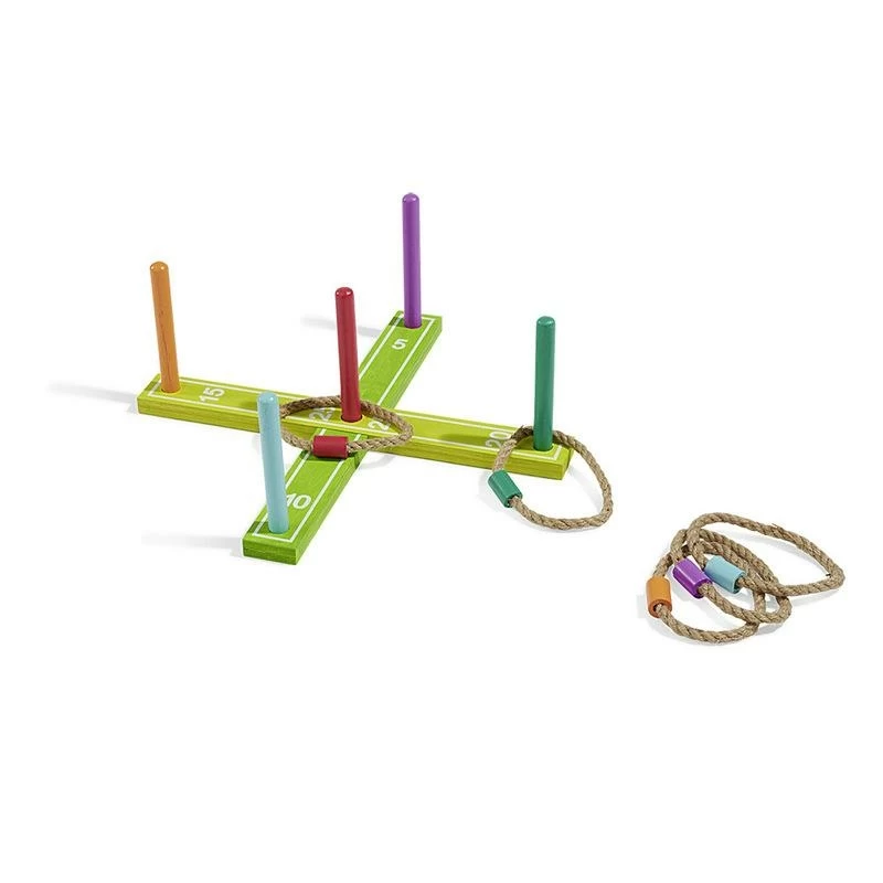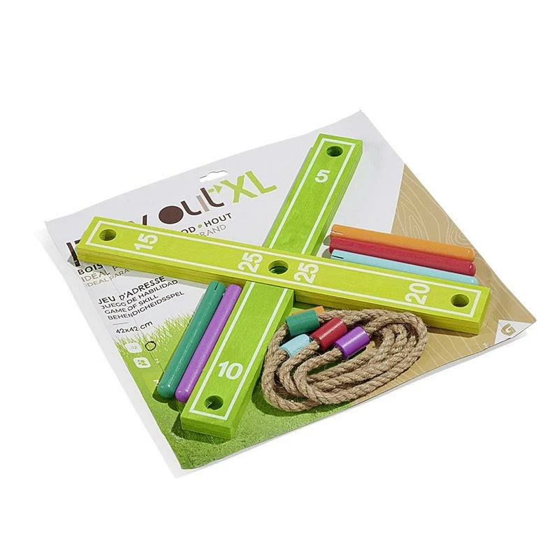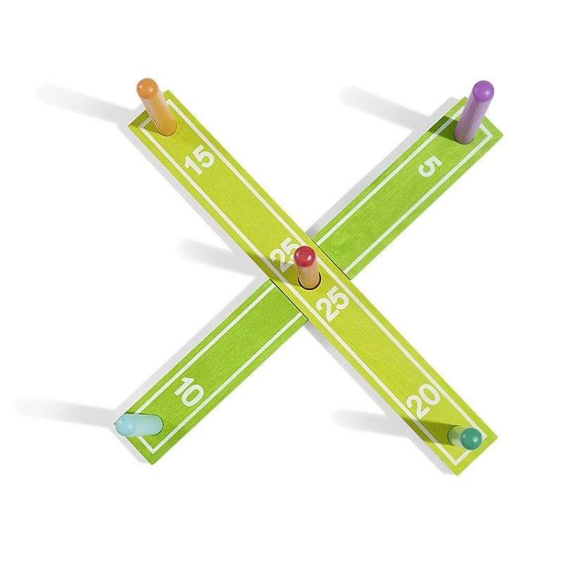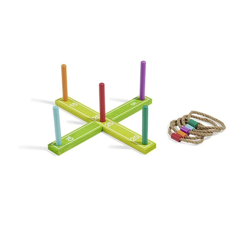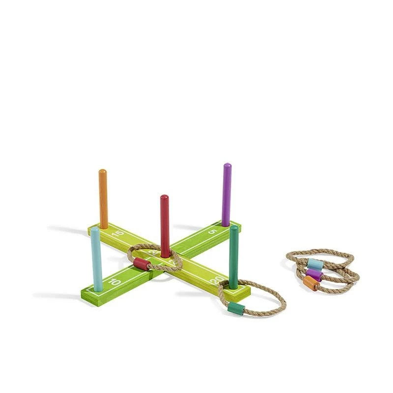 Jeu d’adresse en forme de croix avec 5 bâtons en bois, le but est de lancer les anneaux autour des bâtons. Dimensions: 42x2x5cm.