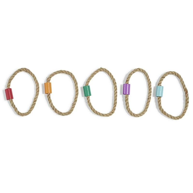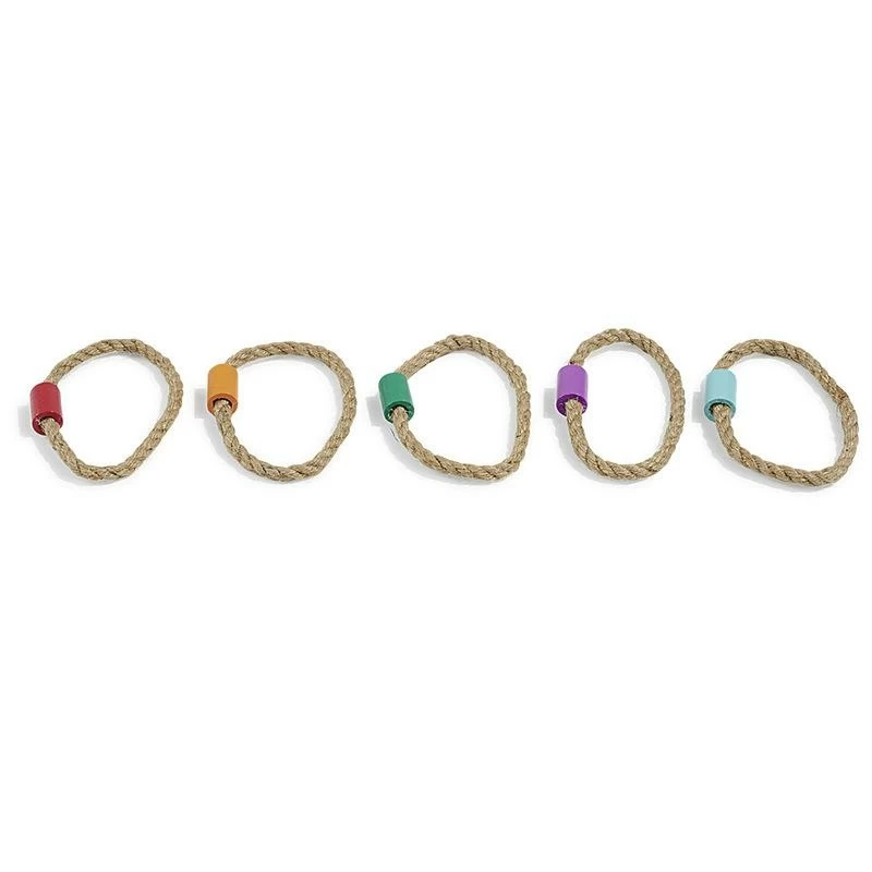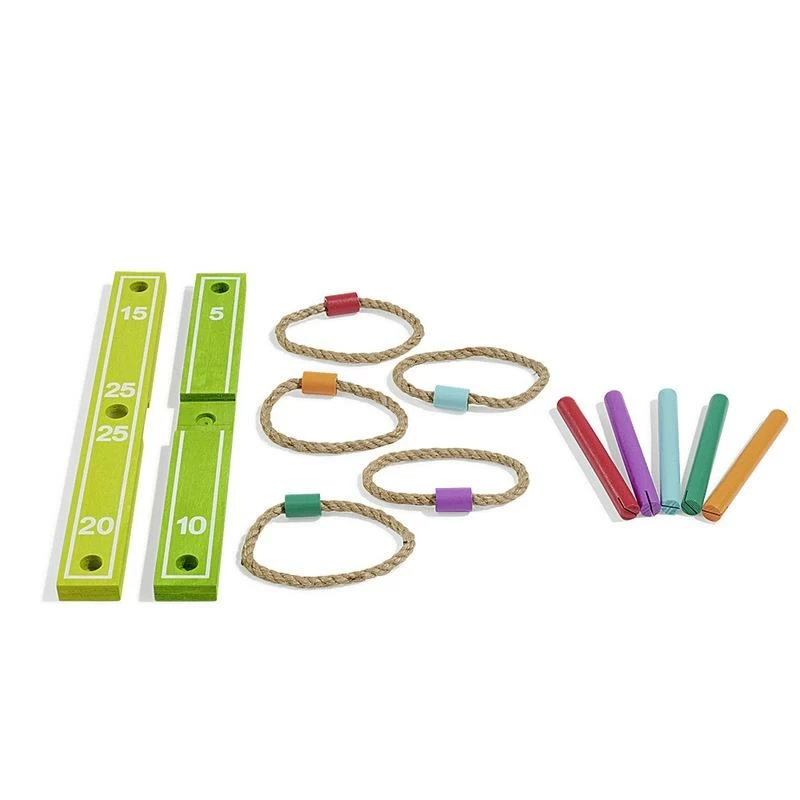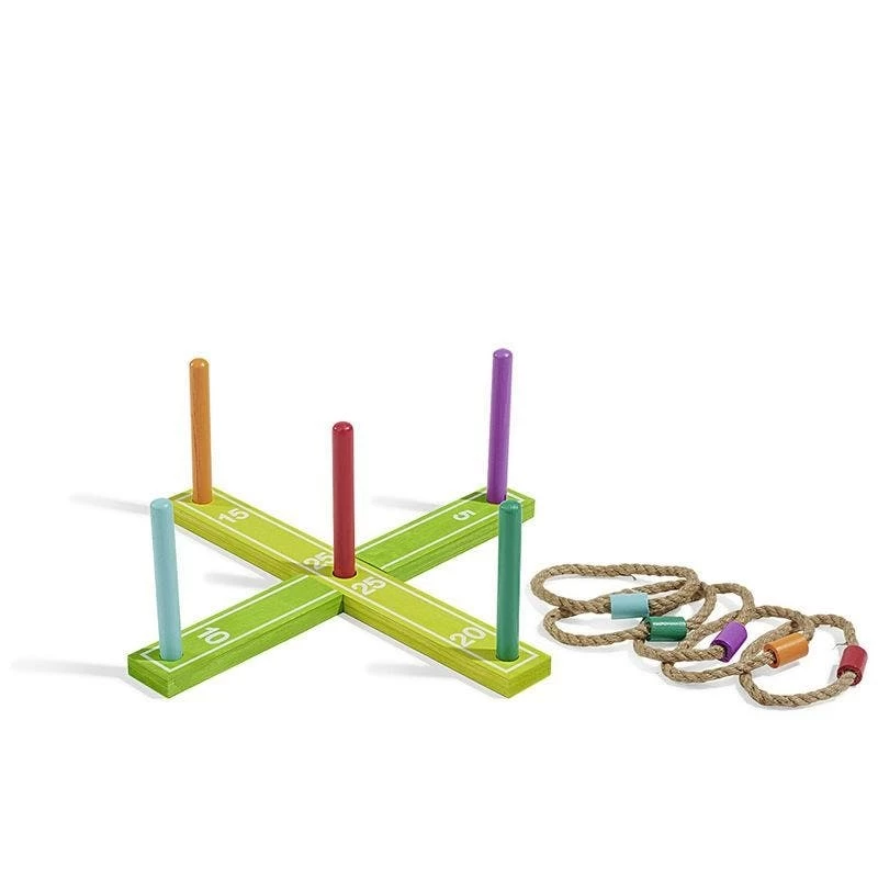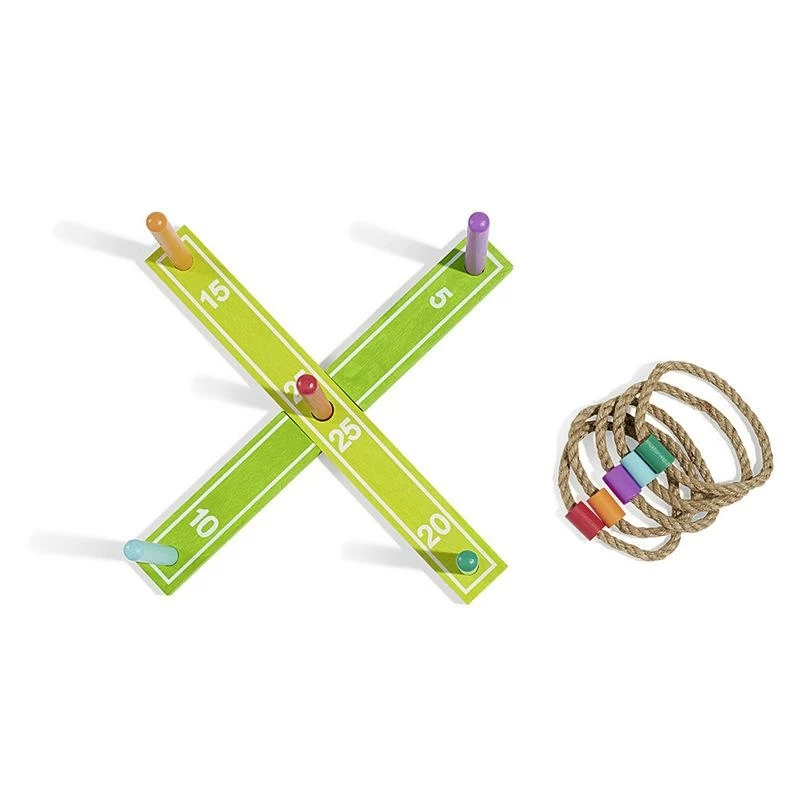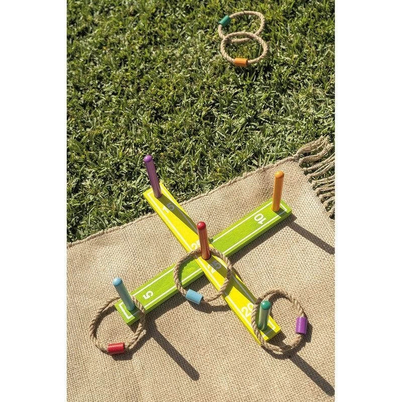Jeu d’adresse en forme de croix avec 5 bâtons en bois, le but est de lancer les anneaux autour des bâtons. Dimensions: 42x2x5cm.