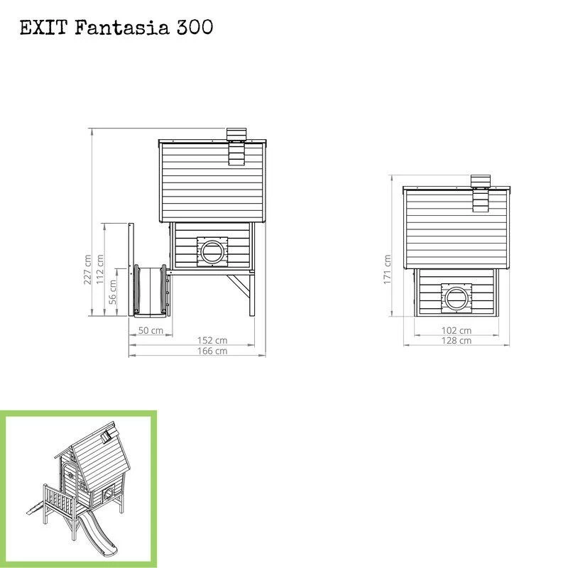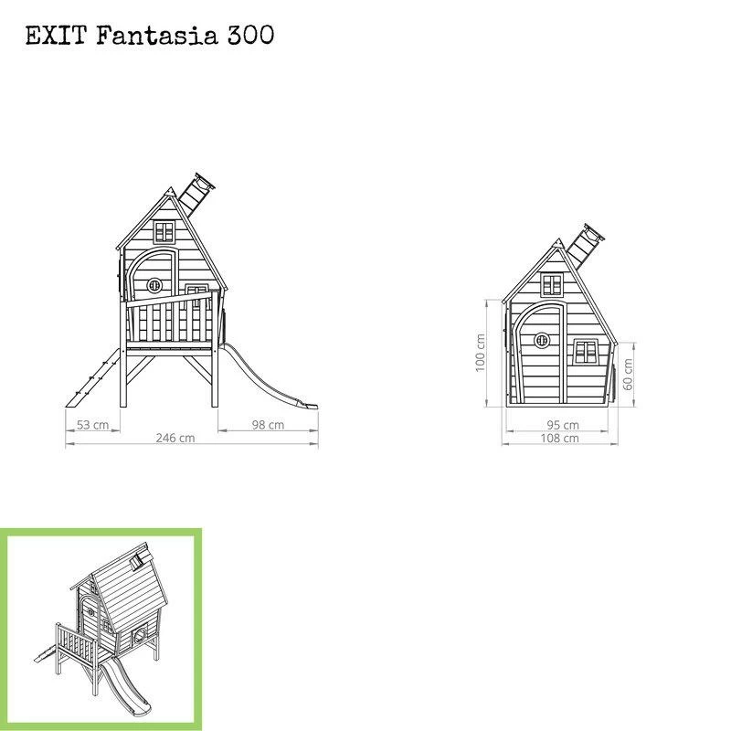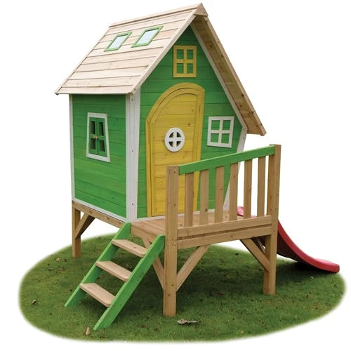 La maisonnette Fantasia 300 est une cabane de jeu ludique, posée sur des pieds et équipée d’un beau toboggan.