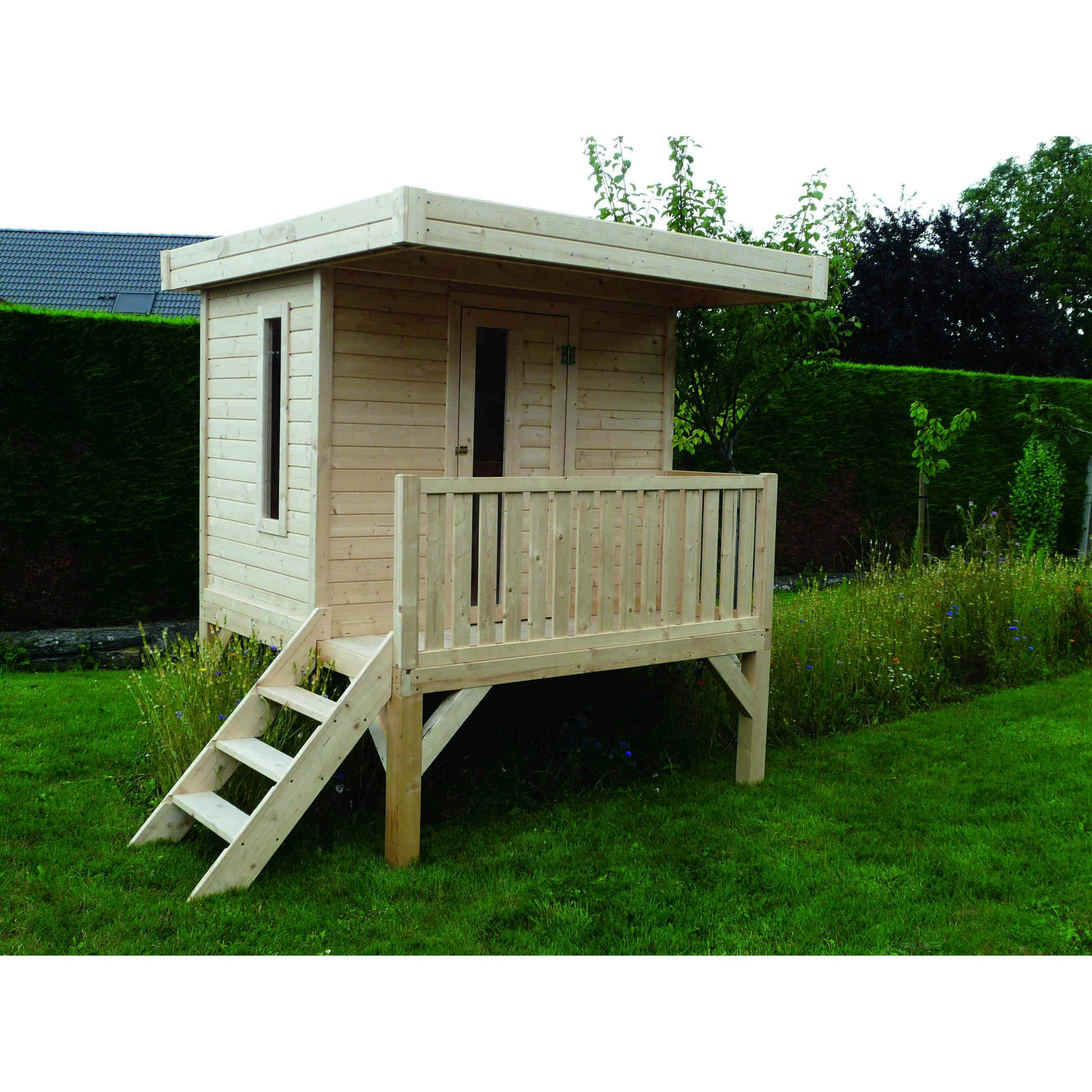 Maisonette enfant constitué de panneaux en bois de 16 mm. Slide & screw : les profilés en bois avec languettes et rainures sont faciles à glisser les uns dans les autres et les extrémités sont vissées individuellement aux poteaux d’angle en bois