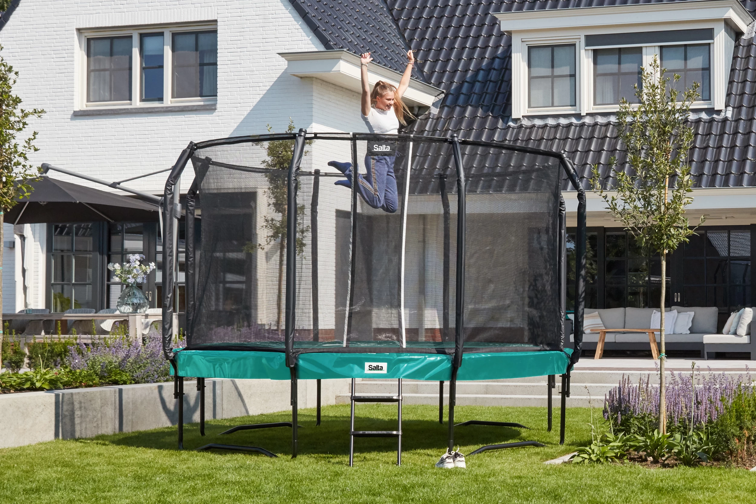 Découvrez un plaisir de saut sans précédent avec le trampoline Salta First Class. Ce trampoline extrêmement luxueux offre une qualité de première classe ! Seuls les meilleurs matériaux, les plus solides et les plus sûrs ont été utilisés pour ce trampoline supérieur. C’est pourquoi cette ligne de trampoline de première classe offre la qualité ultime ! Les trampolines de première classe sont tous équipés d’un cadre unique, extra-épais, galvanisé et peint par poudrage noir, qui garantit la construction la plus solide et la plus robuste. Le magnifique bord de sécurité a un aspect très luxueux grâce au matériau PVC enduit extrêmement épais de 0,76 mm. Il va sans dire que la Salta – Première Classe répond aux normes de sécurité les plus récentes. Les cadres supérieurs sont construits avec une fixation carrée au bas du cadre, à l’aide d’assemblages à vis fixes. Il en résulte un lien stable et solide. Pendant le saut, le cadre ne peut pas bouger et est donc exceptionnellement silencieux. La Salta First Class offre une quantité remarquable de plumes doubles, coniques et dorées. Les doubles ressorts coniques d’une longueur de 210mm, offrent un confort absolu pour sauter plus haut et atterrir plus doucement. La Salta First Class a une très large marge de sécurité. Le bord de sécurité a une largeur d’au moins 37 cm. En outre, l’épaisseur du coussin de bordure n’est pas inférieure à 32 mm et résiste aux UV et aux intempéries. La bordure de sécurité est fixée au cadre du tapis de trampoline pour empêcher les utilisateurs d’entrer en contact avec les ressorts ! Le filet de sécurité est constitué d’un petit maillage durable et résistant aux UV. En raison de la densité élevée du filet de sécurité, il est très doux au toucher. Les montants du filet de sécurité sont entourés d’une couche de mousse très épaisse. Les trampolines de première classe sont tous équipés d’une échelle.