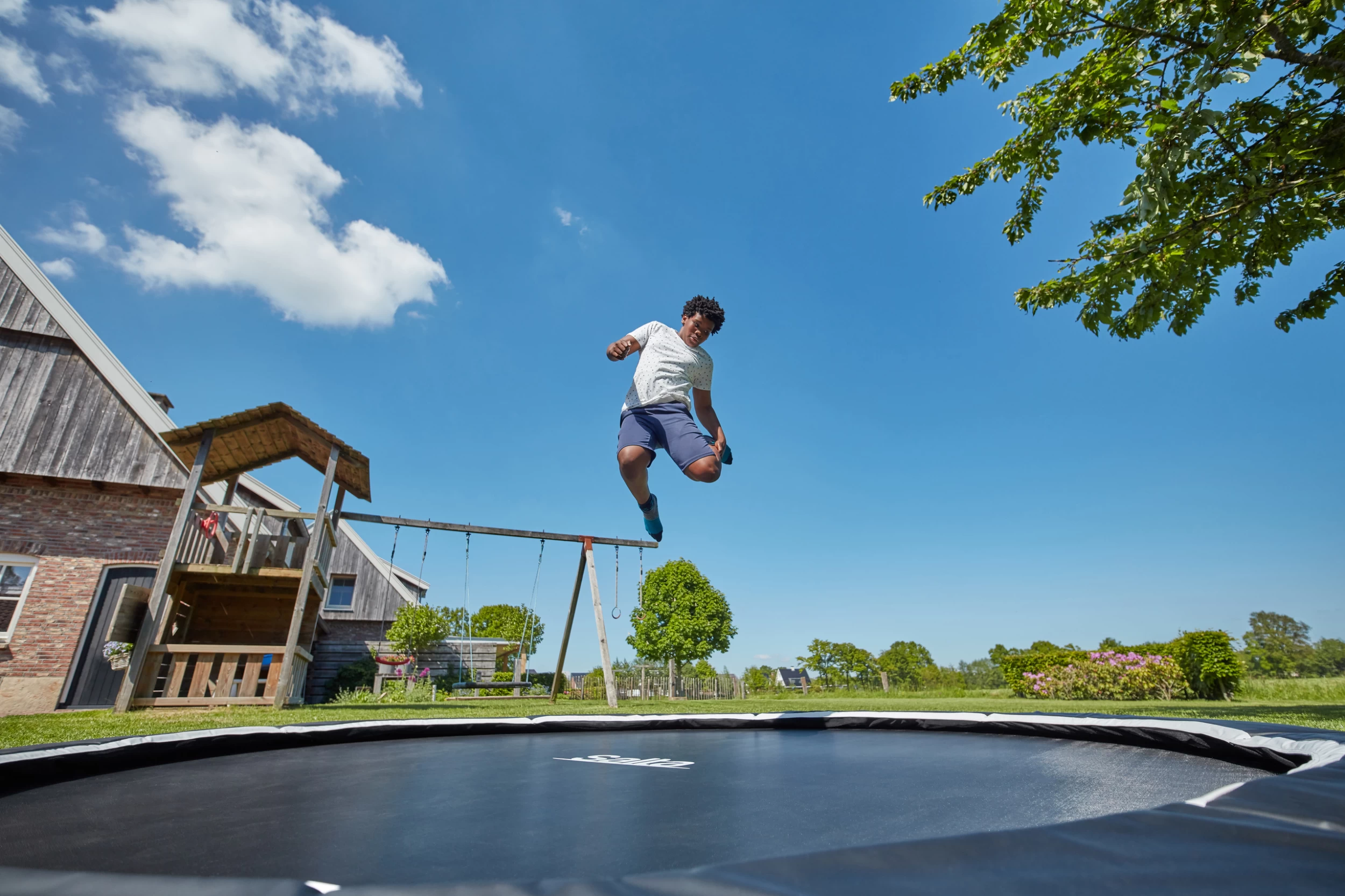 L’extérieur du Royal Baseground est équipé de panneaux robustes qui assurent une fondation très stable. Le cadre durable et robuste est doublement galvanisé et revêtu de poudre noire pour éviter la rouille. Le bord de sécurité noir du terrain de base Royal est constitué d’un matériau PVC robuste et de haute qualité. Le système de filet pratique fixé au bord de sécurité empêche les enfants d’entrer en contact avec les ressorts. De plus, le bord passe joliment sur l’herbe à l’extérieur, de sorte que les enfants peuvent entrer dans le trampoline en toute sécurité.