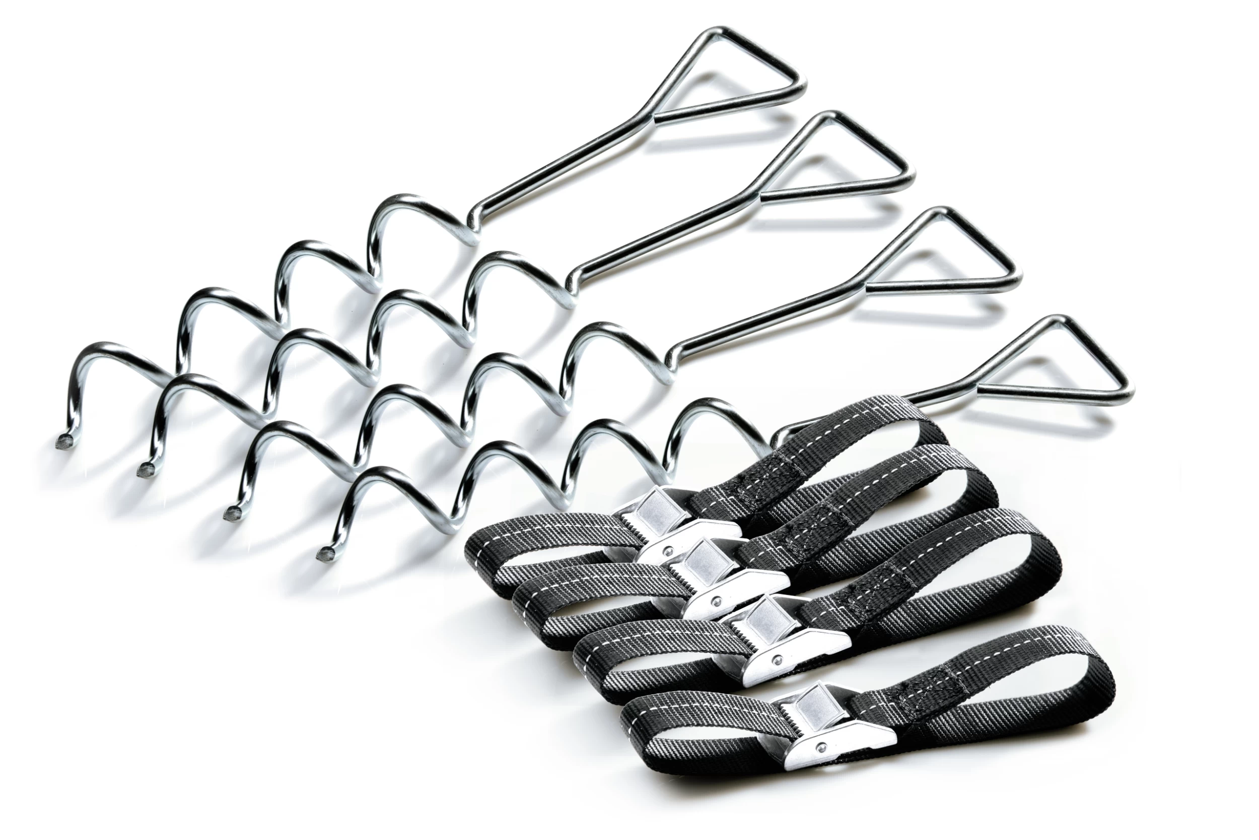 Grâce à leur forme en spirale, les ancrages sont faciles à visser dans le sol et conviennent aussi bien aux sols mous que durs. Le kit se compose de 4 ancrages au sol galvanisés (L43cm Ø8mm), avec 4 sangles en polyester résistant aux intempéries sur une boucle robuste en fonte.