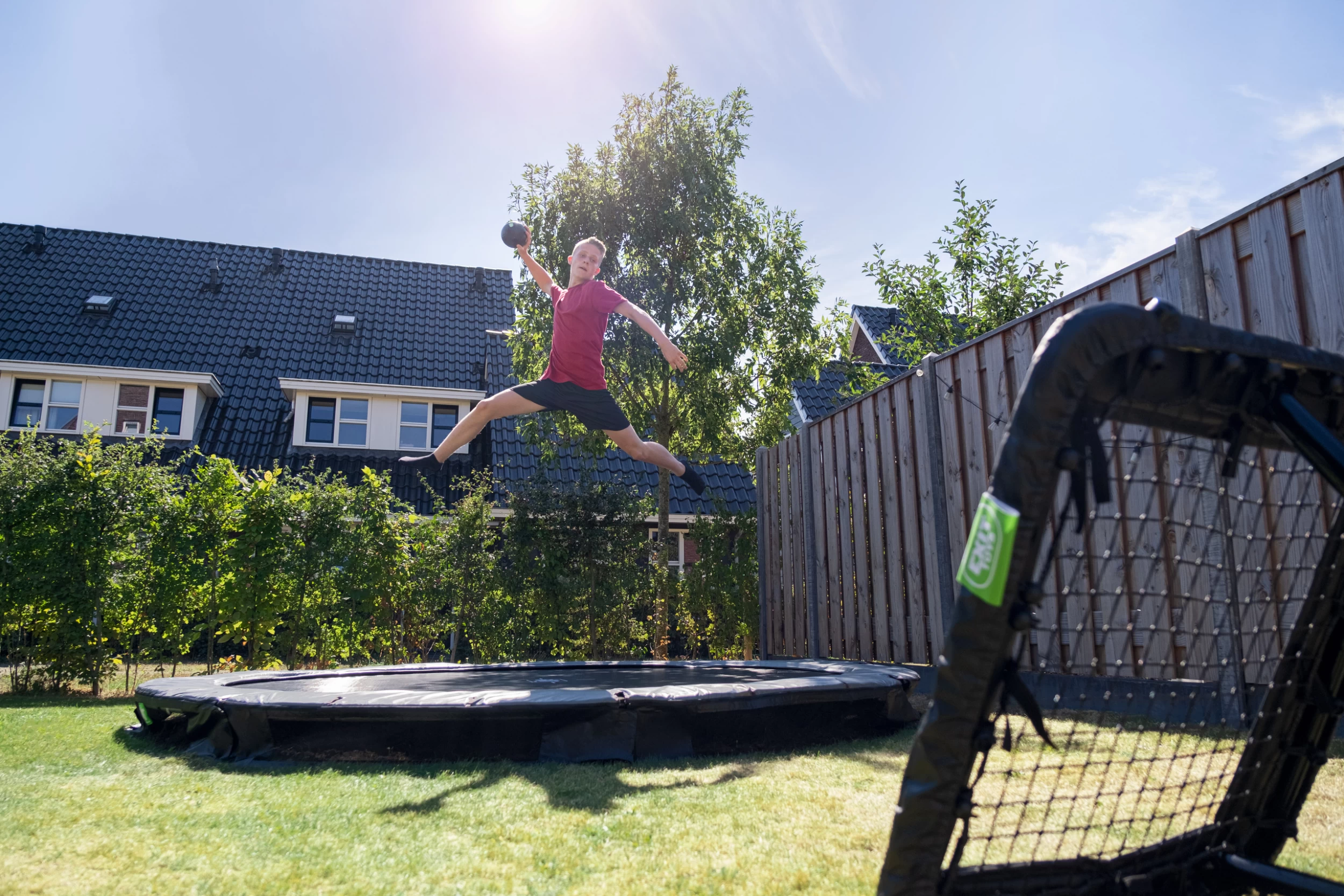 Ce trampoline enterré Elegant Premium sports est livré sans filet de sécurité. Cela signifie automatiquement qu’ils ne relèvent pas du marquage CE, et qu’ils sont adaptés à tous à partir de 14 ans. Bien sûr, nos trampolines de sport respectent toutes les autres exigences de sécurité applicables aux trampolines. Pour une sensation de sécurité optimale, ce trampoline est également disponible avec un filet de sécurité de haute qualité avec porte chevauchante ou avec les dalles de sécurité uniques EXIT Freezone.