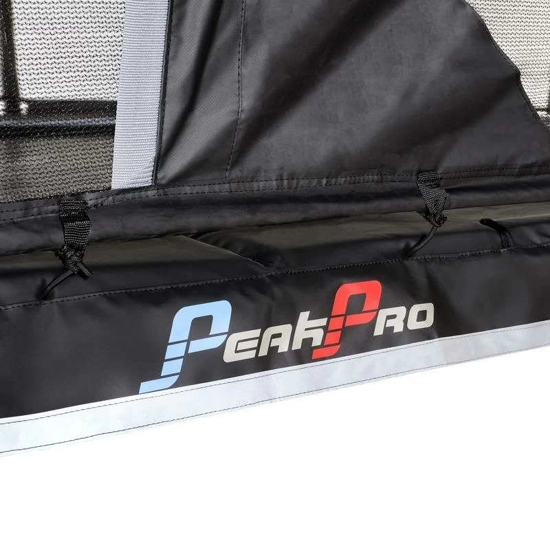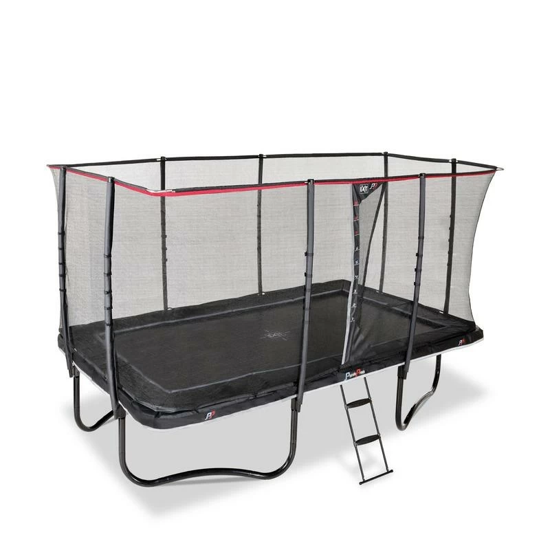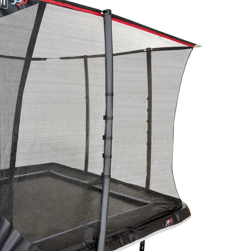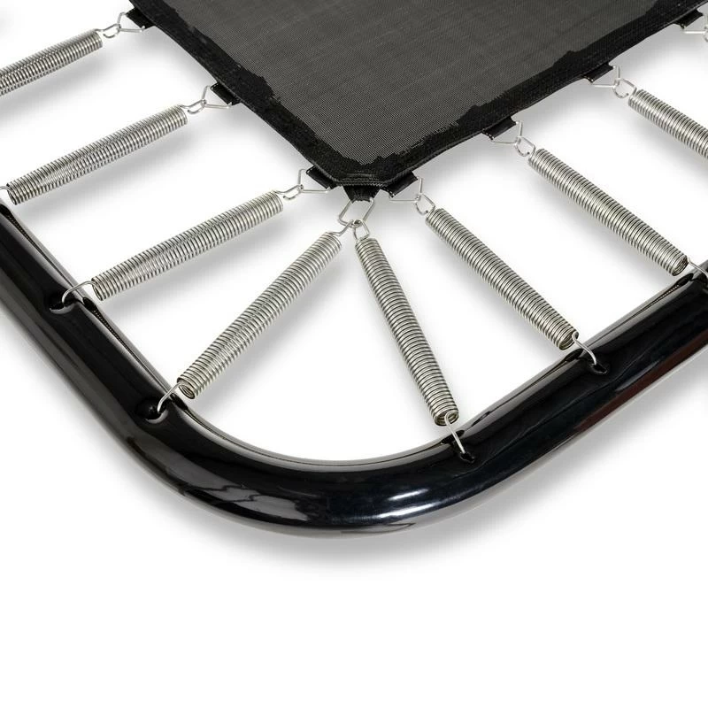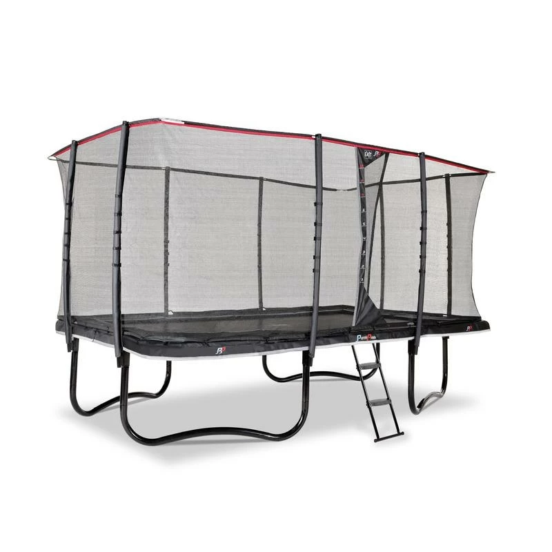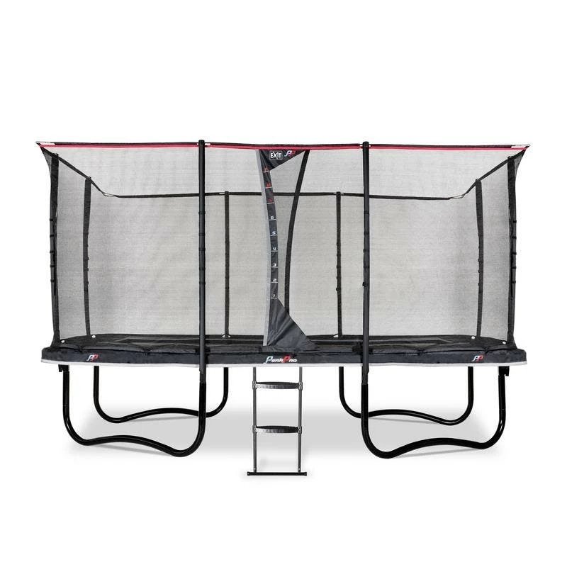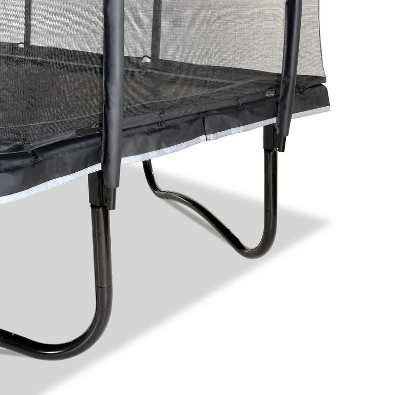 – Dimensions de la surface de saut: 244 x 427 cm- Dimensions totales: 266 x ‘437 x 288 cm- Épaisseur du cadre tubulaire: ø 56 x 2 mm- Largeur du bord de protection: 45 cm.- Hauteur d’accès au trampoline: 90 cm.- Nombre de pieds: 4- Nombre de ressorts: 84- Charge maximale supportée: 130 kg